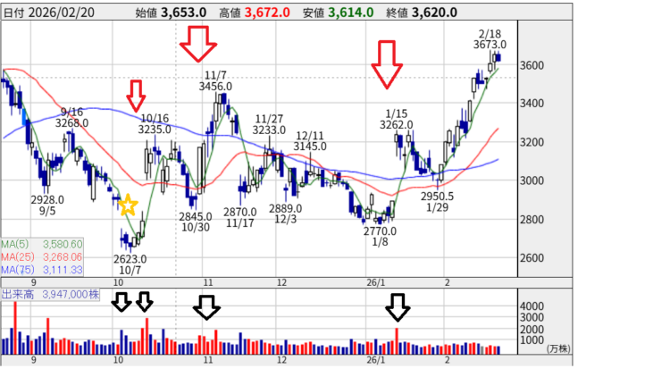 10月7日の底値(2,623円)から、10月16日の高値(3,235円)まで