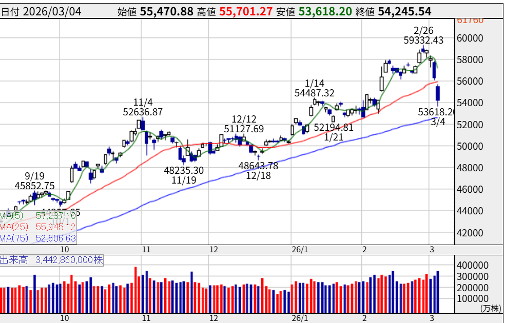 ・日経平均: 2月末まで絶好調だったのに、今月に入って崖を転げ落ちるような下落。