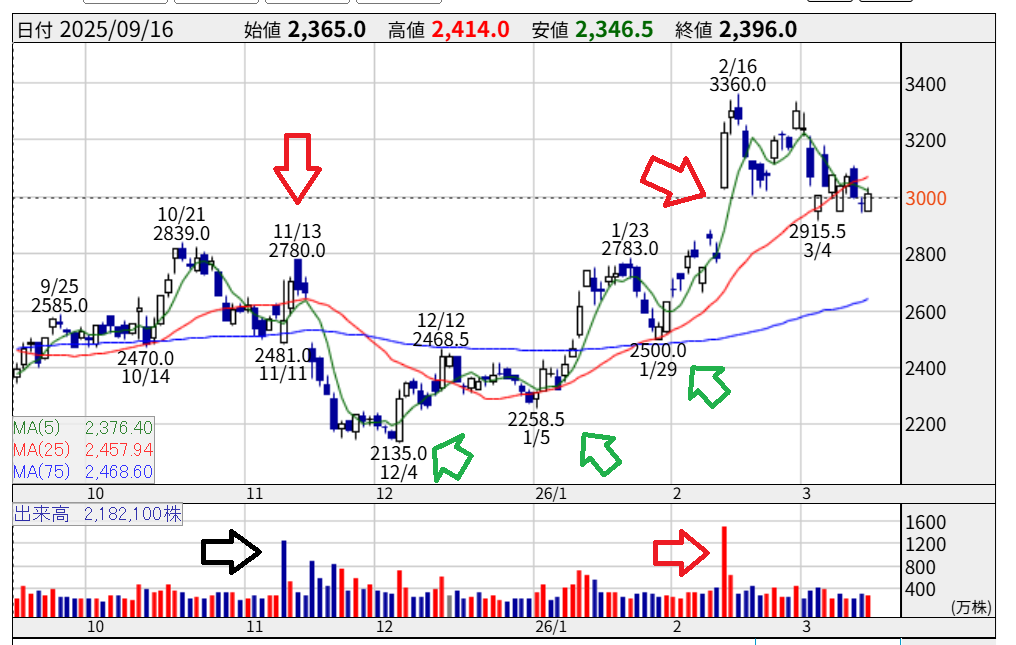 チャートを見てみると、11月13日、2,780円の高値から、急に下落していますよね。