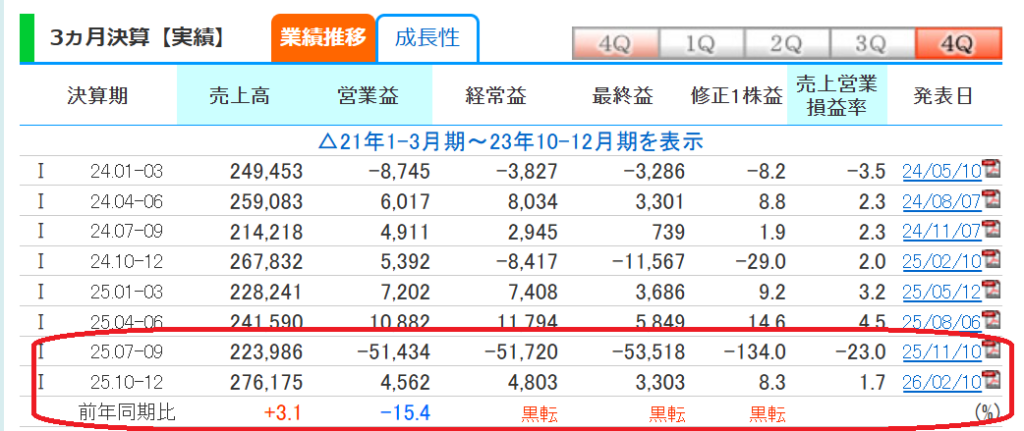 11月10日に発表した、25-07-09の決算が、マイナスのオンパレード