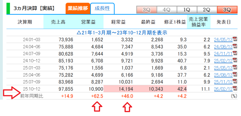 しかも、営業利益は前年比プラス62.5%!経常利益も前年比プラス46%